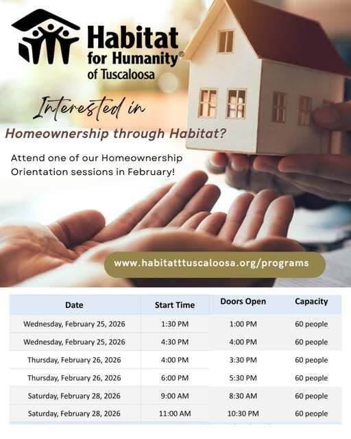 Habitat Tuscaloosa will hold six (6) Information Meetings in February. Attend one (1) of our application meetings to learn about the Habitat Program and receive an application.