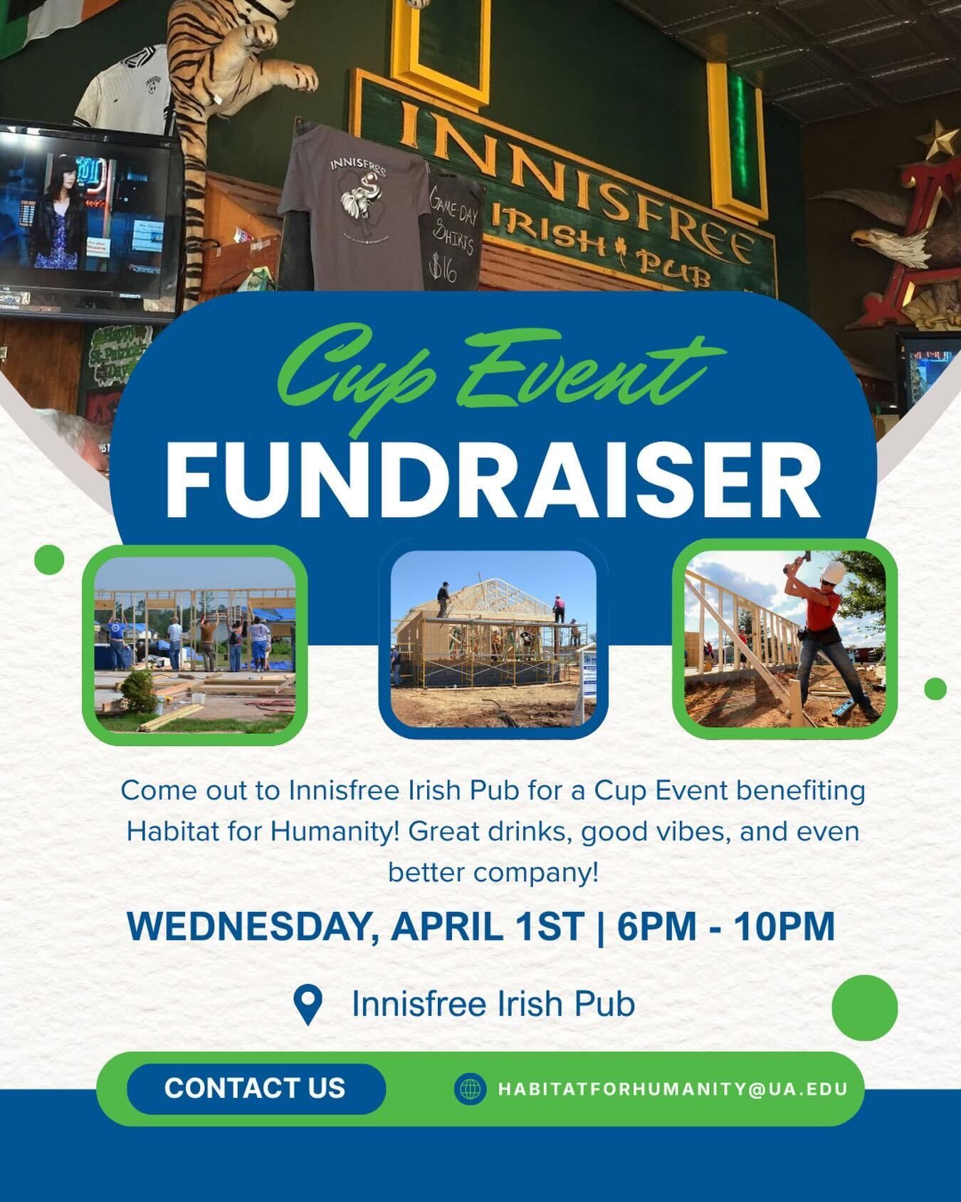 Join us Wednesday, April 1st from 6PM-10PM at Innisfree Irish Pub for a Cup Event supporting Habitat for Humanity! 💚🏡