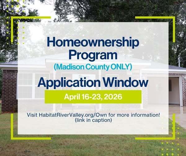 Exciting news! Habitat for Humanity of the River Valley will be accepting Homeownership Program applications April 16-23, 2026 for those who live and/or work in Madison County.