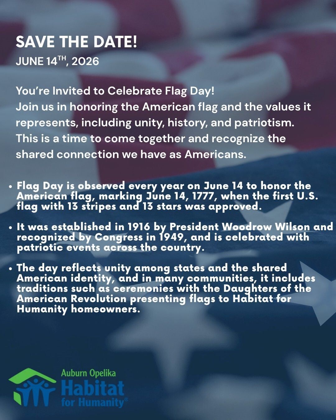 Auburn Opelika Habitat for Humanity looks forward to once again partnering with the Light Horse Harry Lee Chapter of the Daughters of the American Revolution for our annual Flag Day observance. Each year, this tradition includes the presentation of an American flag to one of our Habitat homeowners. This presentation serves as a symbol of pride, freedom, and the shared values that unite our community.